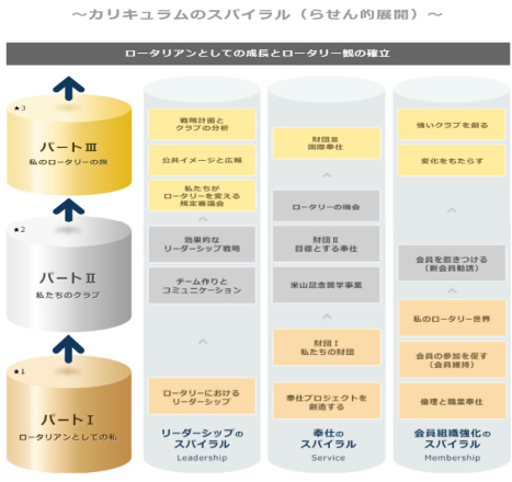 RLIの国際統一形式のカリキュラムは、パート毎に1日6セッションを3日間合計18セッションからなっています。パートⅠは、「ロータリアンとしての私」、パートⅡは「私たちのクラブ」、パートⅢは、「私のロータリーの旅」の各セッションを「リーダーシップ」、「奉仕」、「会員組織の強化」の3つの視点で、ロータリーを考えます。